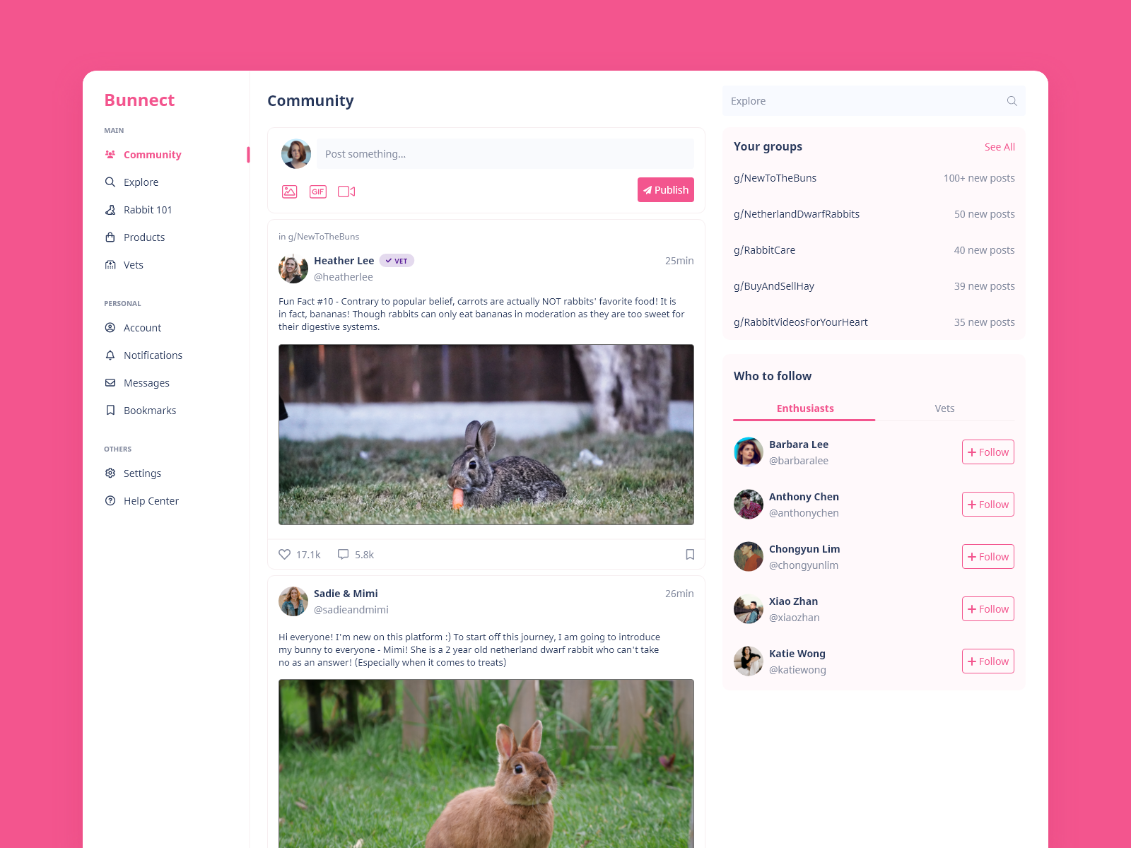 Bunnect is a fictitious social networking site that allows bunny enthusiasts, owners, and rabbit-specialized veterinarians to communicate online. It seeks to give useful information, goods, and veterinarian clinics for rabbit owners and lovers.