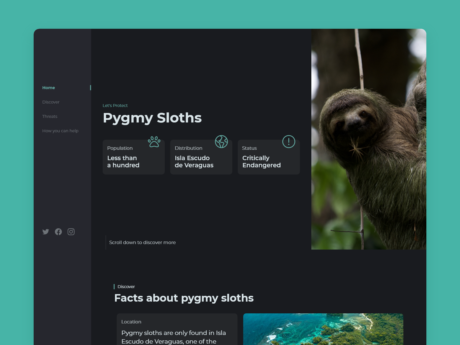Let's Protect Pygmy Sloths is a fictional one-page-scroll website to spread awareness for Pygmy Sloths, a critically endangered species.