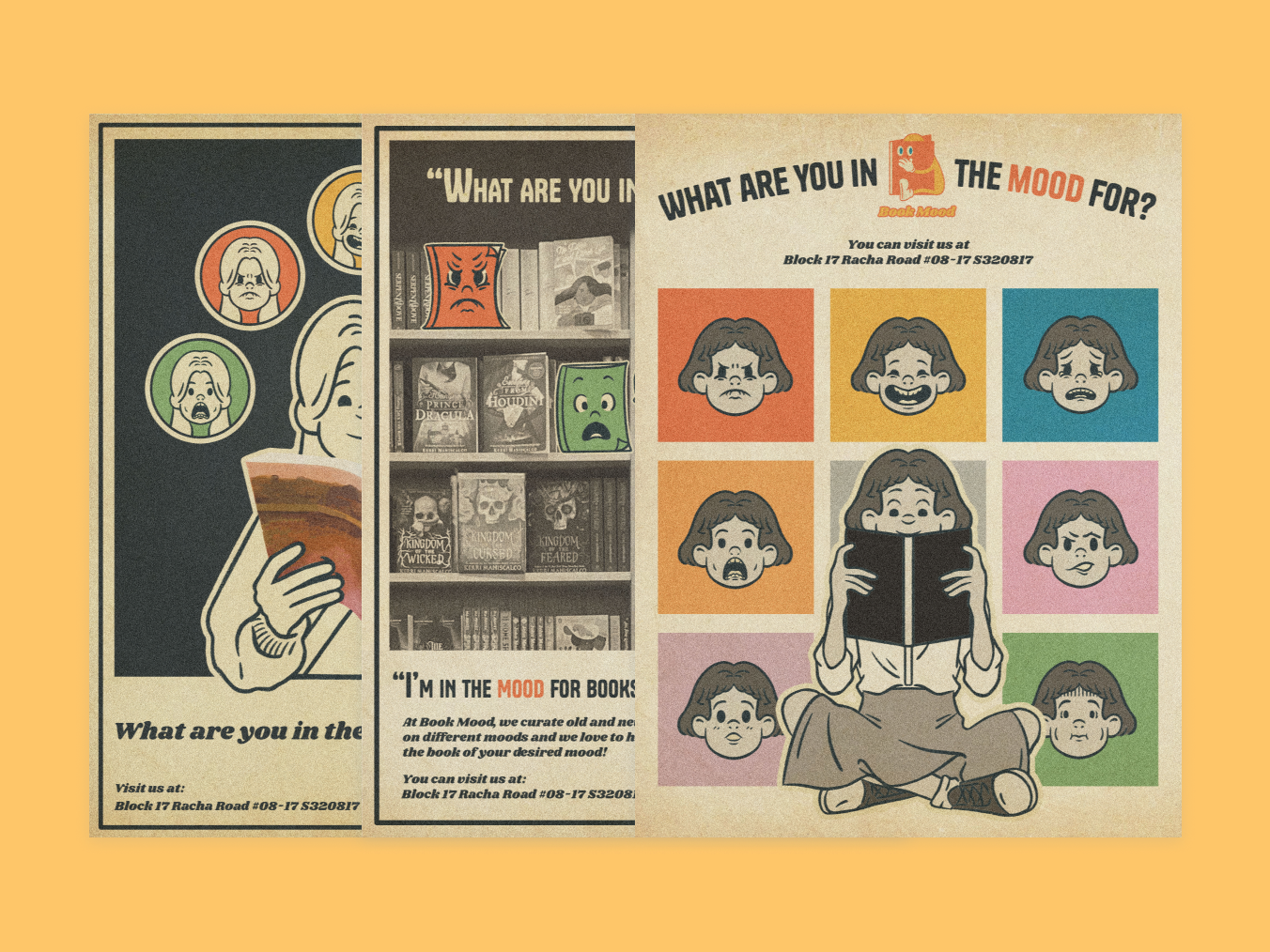 The concept behind the Book Mood posters is to portray the numerous emotions contained within book contents in a vintage style that matches the store's brand. I was inspired by numerous classic movie posters for their retro style and layout, as well as graphic design posters for the different colours and textures that may fit the time period.