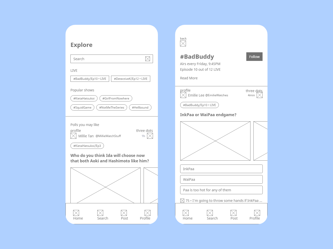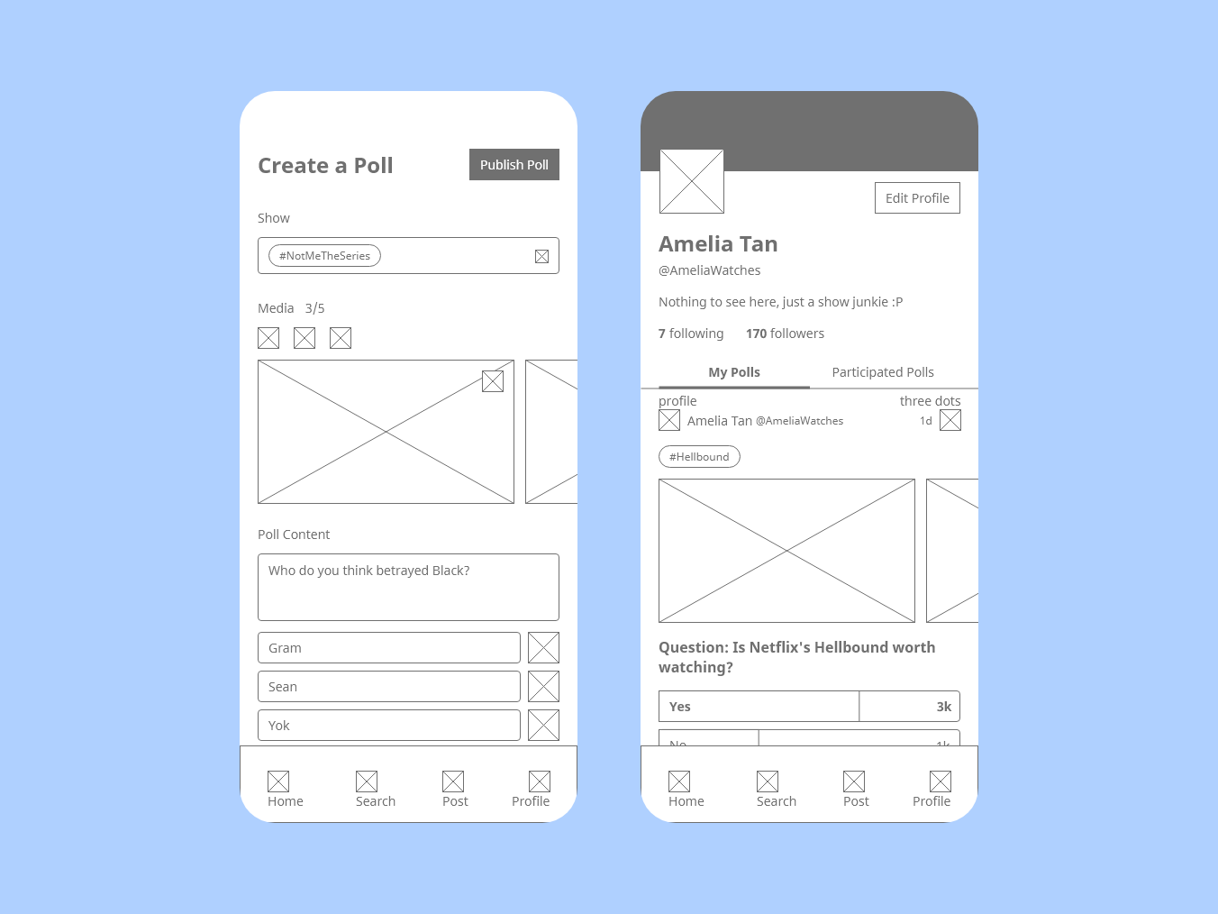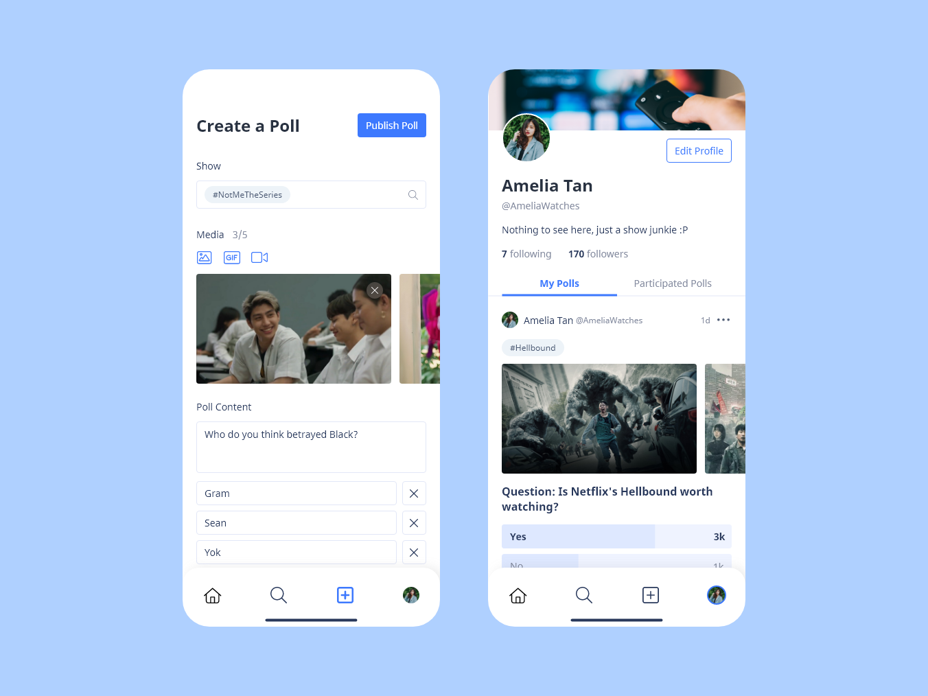 Dramapoll is a fictional software prototype that allows users to post and engage in polls on shows they are currently watching or interested in.