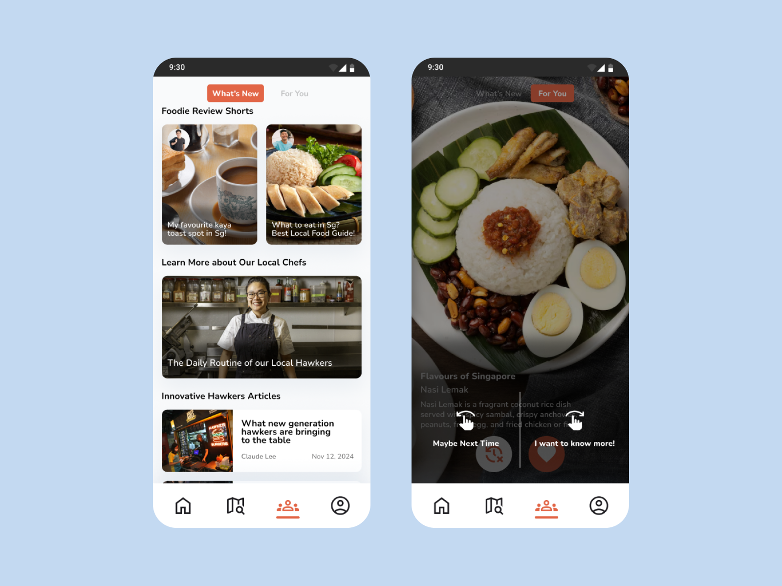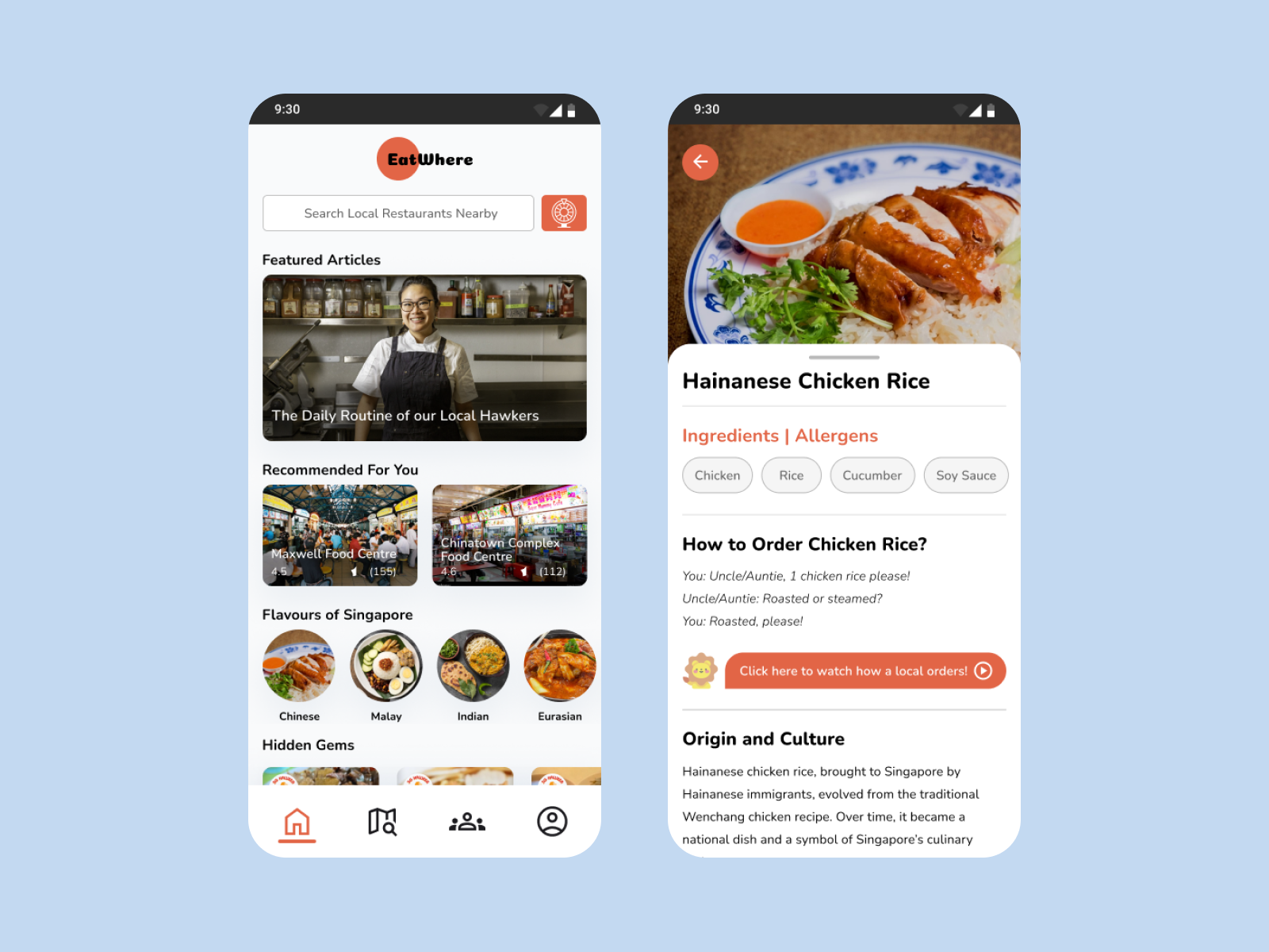 EatWhere is an fictitious app targeted to encourage locals to uncover the hidden gems of local food culture by exploring lesser-known hawker centres and food spots.