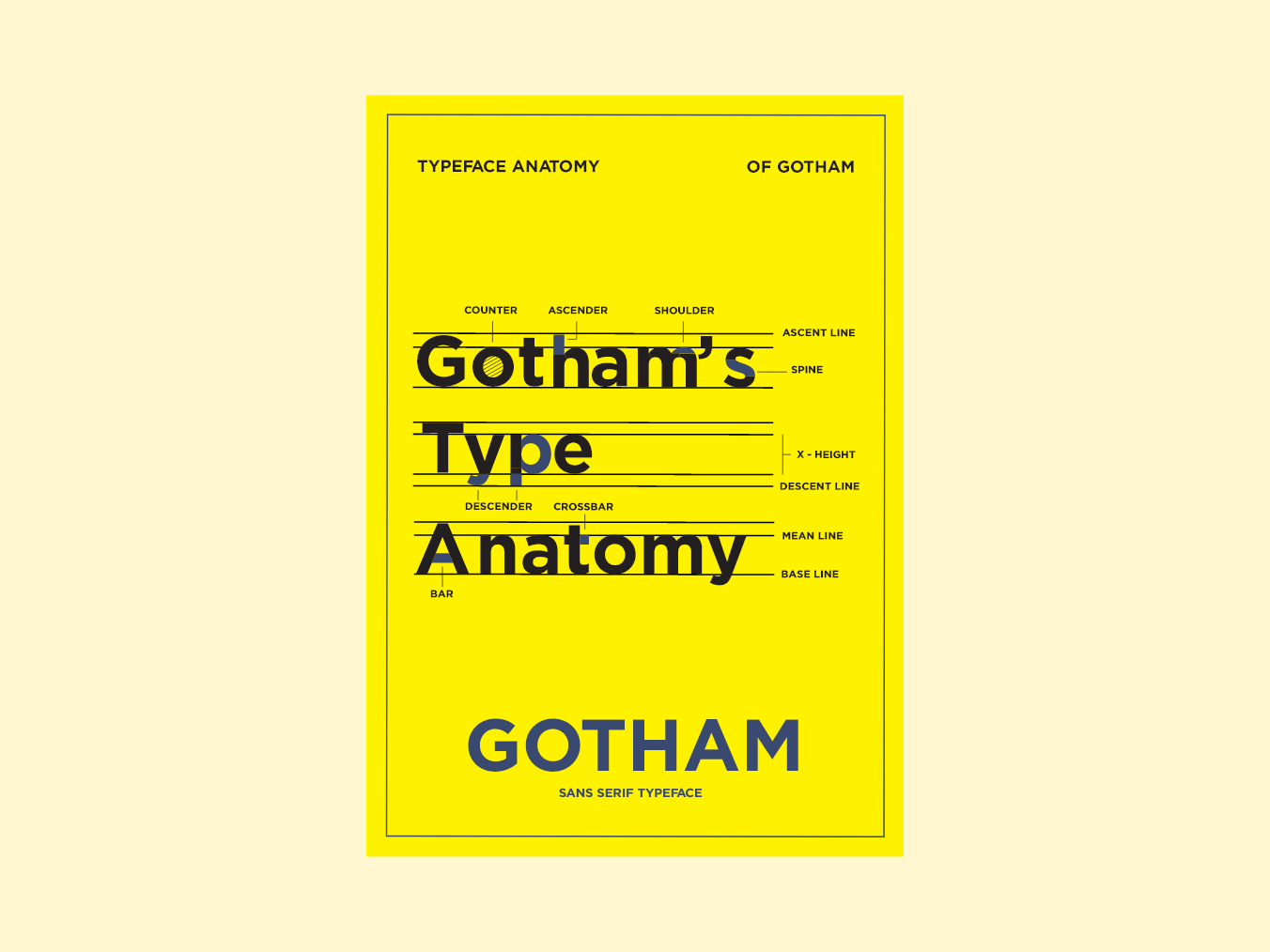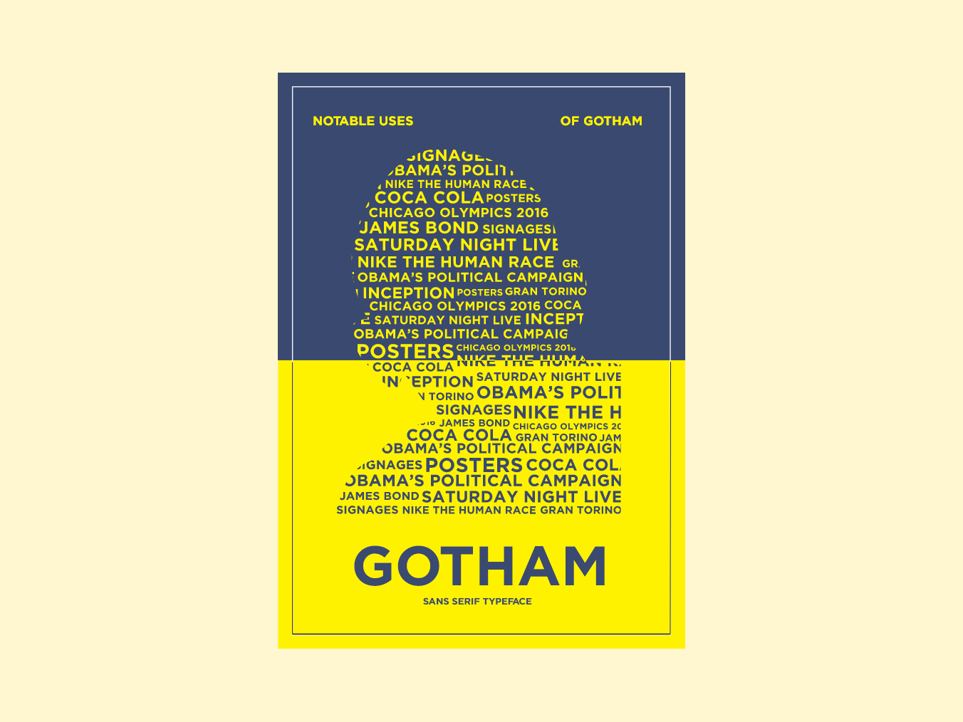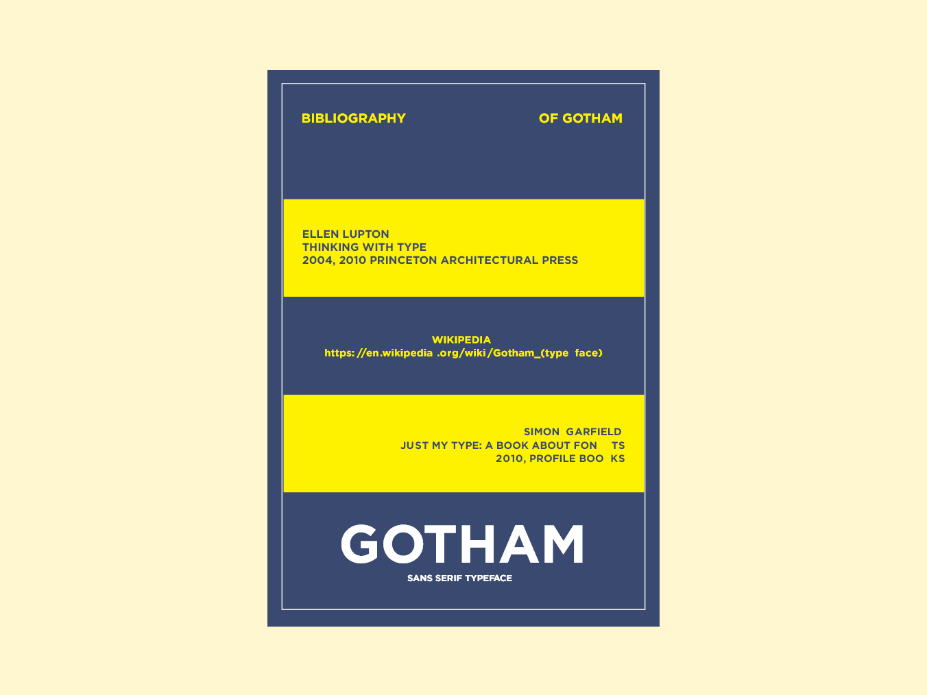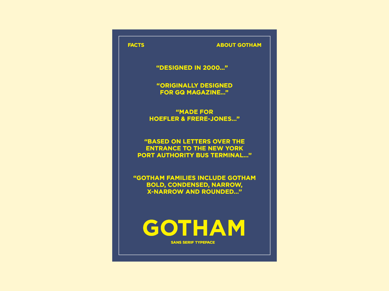 Tasked with researching the typeface and presenting the material in a booklet, I used a noteworthy line of famous Gotham users to demonstrate my grasp of the typeface and presented the information in a variety of plain and innovative ways to keep the pamphlet entertaining.