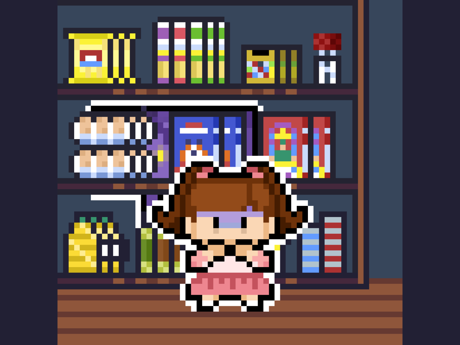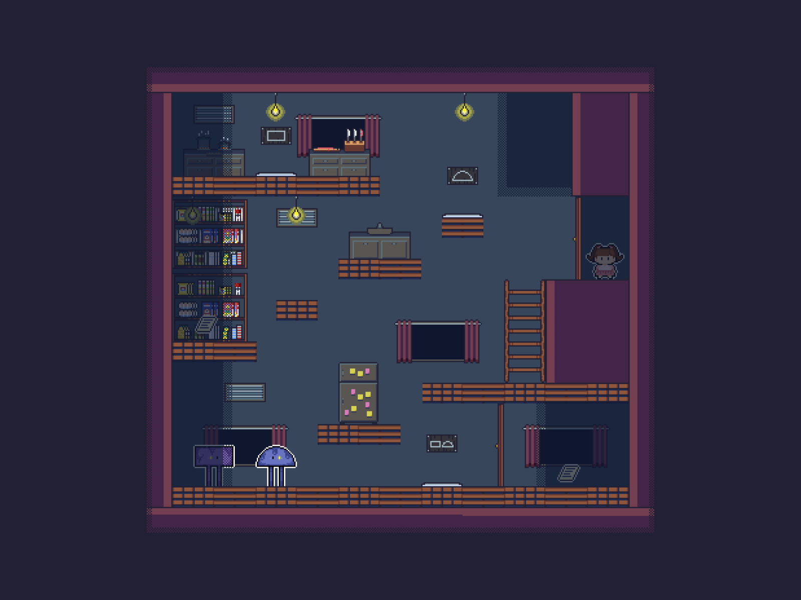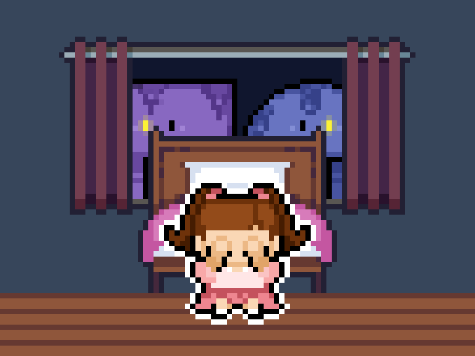 The characters in the game are drawn in pixel art style and are designed to be rather cute to have them contrast against the dark environment of the game, making the players feel emotionally unbalanced and have a sense of unease. The characters also give subtle clues in the game that something isn’t right - such as Sophie having dark eye bags under her eyes.