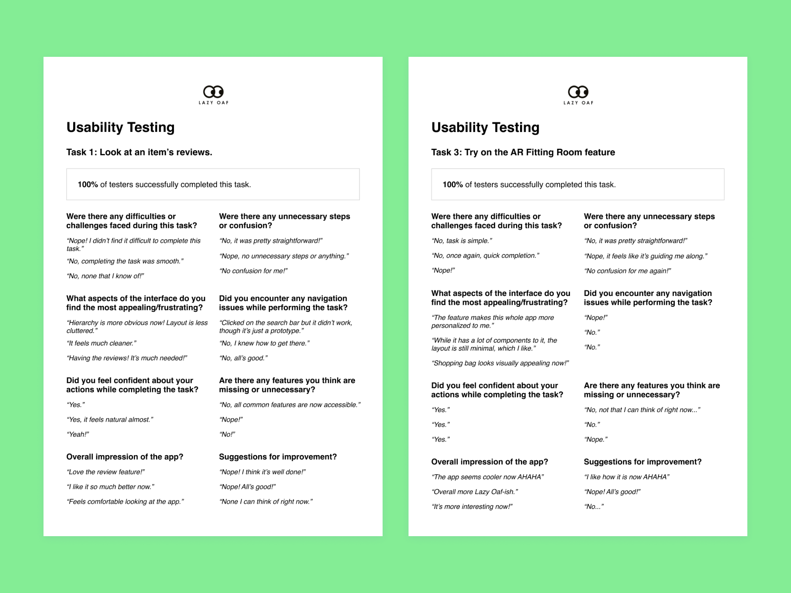 After creating the high fidelity prototype for Lazy Oaf's mobile app, I ran some usability testings with some of the participants from the surveys.